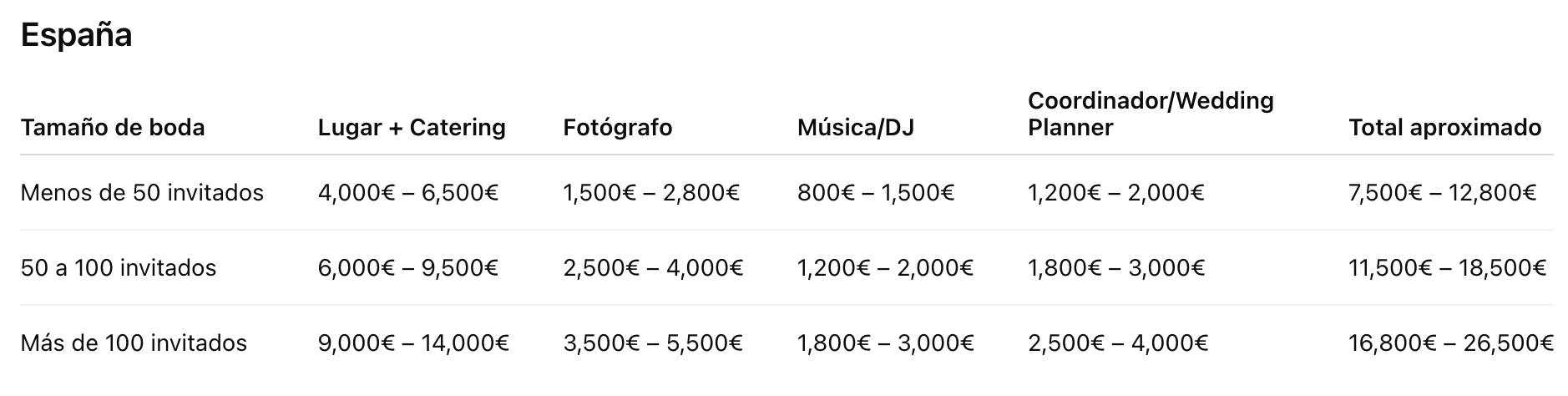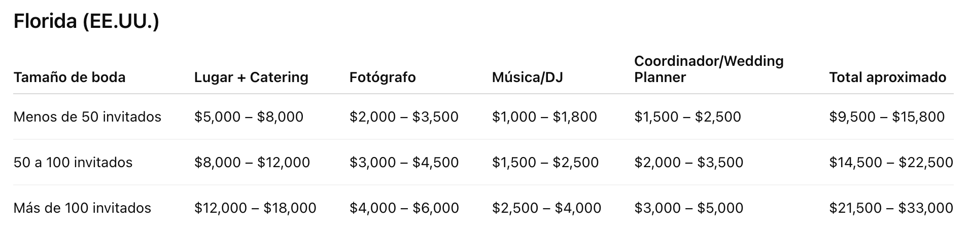 Te comparto precios aproximados para bodas con diferentes números de invitados, divididos entre Florida (EE.UU.) y España, para que tengas un marco de referencia realista: